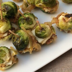 - Take one half of a Brussels sprout, smear with mustard, add a piece of gruyere and a pinch of onions. Take the other half of the Brussels sprout and position it so the two sprouts are like the buns on a burger, with the cut sides facing each other, and secure with a toothpick. Serve at room temperature or warm on a baking sheet in a 325 degree oven for 10 to 15 minutes.