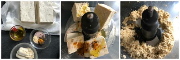 - In the bowl of a food processor, process the tofu, ½ Tablespoon of oil, salt, turmeric, garlic powder and black pepper until smooth. Scrape down the sides and add the chickpea flour. Process until well combined.