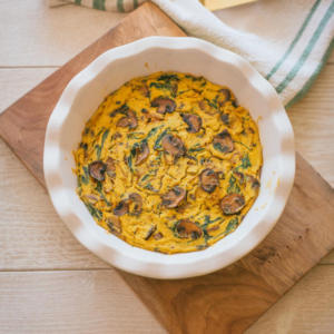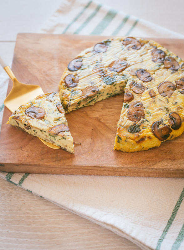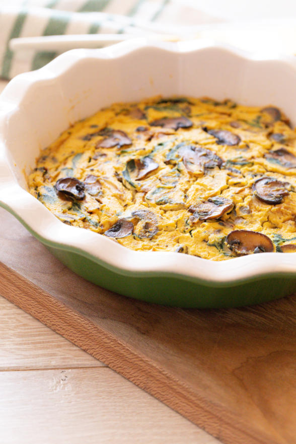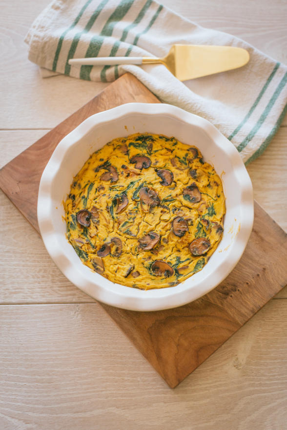 Pick any veg you like to cook in a frittata – asparagus, spinach, Swiss chard, broccoli, leeks, zucchini. Just cook them before adding to the tofu puree. Saute, roast, grill – whatever you like!