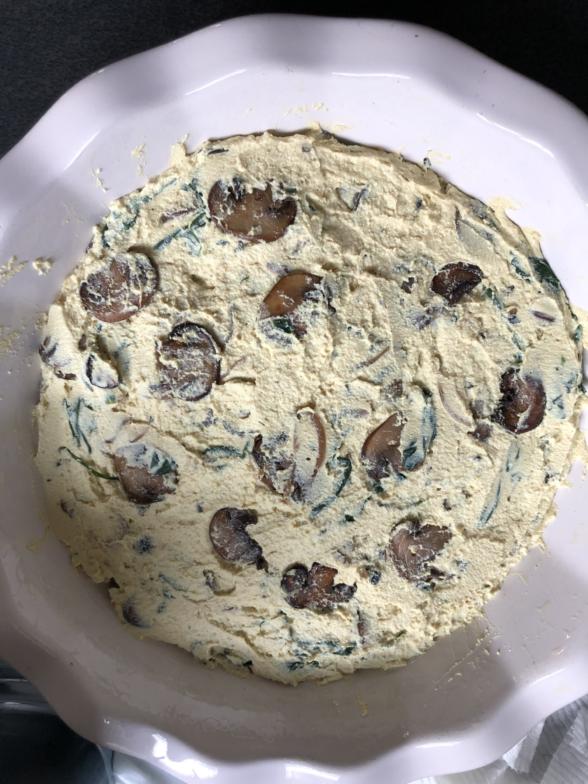 This recipe is very easy – just saute some vegetables; puree the tofu, chickpea flour and seasonings together; stir the veggies into the tofu mixture and bake in a pie plate. Use whatever your favorite vegetables are with eggs or defrost and chop some frozen veggies (which have already been blanched before freezing.). The texture is similar enough to a frittata, although of course not exactly the same. It’s tender and soft, and studded with delicious vegetables. It’s definitely worth trying to mix it up a little at home or if you’re craving a frittata and you can’t get eggs.