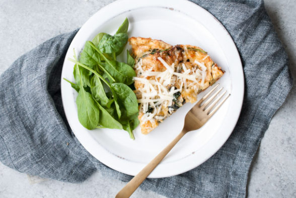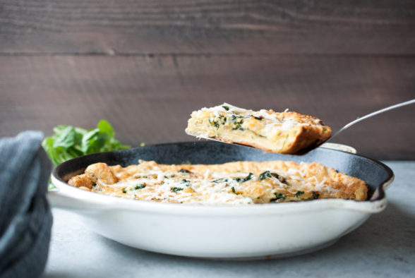 A couple of my students served this to their families for dinner as well as breakfast and brunch, which I think is a great idea either with or without a green salad. For those of you that are comfortable ad libbing in the kitchen, you can swap out the spinach and onions for other ingredients, as long as they are cooked ahead of time, such as roasted cherry tomatoes or kale. Note that this will not puff as much as a traditional Dutch baby because the batter will be weighed down with veggies. That’s why if you leave a 1-inch border empty around the perimeter, the edges can still puff up.