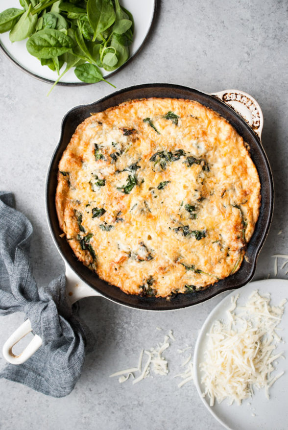 - Remove hot skillet from the oven and carefully add the remaining 2 Tablespoons of avocado oil. Pour batter into the skillet with the avocado oil and (using an oven mitt). Arrange onions, spinach, and cheese on top of batter leaving a 1-inch border around the edge of the pan without any vegetables. Bake until puffed and set, about 25-30 minutes.