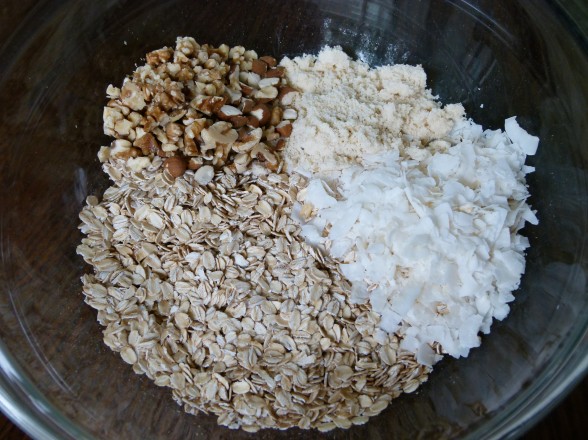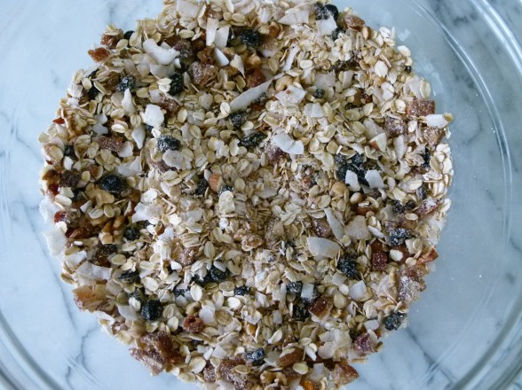 - In a large bowl, combine rolled oats, coconut, almond meal, cinnamon and salt. Add the nuts and dried fruit combine with the mixture, breaking up the dried fruit so it doesn’t clump together (I use my hands to mix this.)