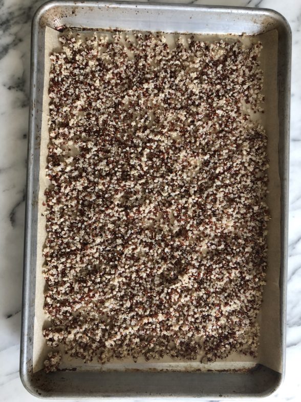 - Preheat the oven to 375 degrees. Line a rimmed baking sheet with unbleached parchment paper. Toss the quinoa with 1 Tablespoon of olive oil and spread quinoa evenly over the baking sheet. Bake in oven for 10 -15 minutes or until crispy. Set aside to cool.