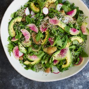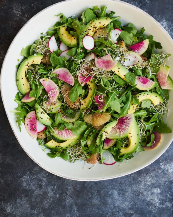 - Assemble salad: Place greens on a platter and toss with enough dressing to coat lightly. Sprinkle with crispy quinoa. Arrange the grapefruit, avocado and radishes on top and drizzle with some more dressing. Top with sprouts if desired and a sprinkle of flaky salt.