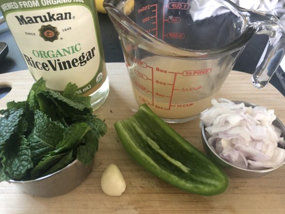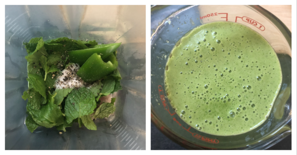 - ½ jalapeño, stem and seeds discarded (optional, but such nice complement to the mint)