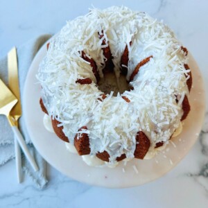 This coconut bundt cake is the kind of recipe that feels nostalgic and dependable all at once. I love serving it for spring brunches, but I also love having a slice with coffee in the afternoon when it’s been sitting on the counter for a day or two – somehow it tastes even better. If you make it, I’d love to hear how it turns out for you!
