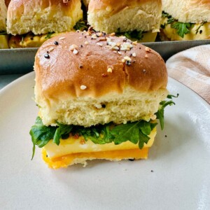 If you’ve made my Italian grinder sliders, vodka sauce chicken parmesan sliders, or even these Brussels sprouts sliders, you know I love a good slider situation. They’re practical, portioned, and easy to serve. This breakfast slider recipe brings that same efficiency to your morning table.