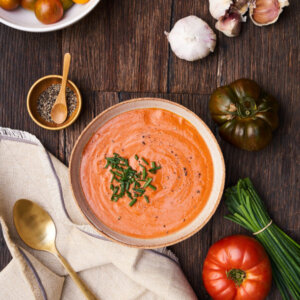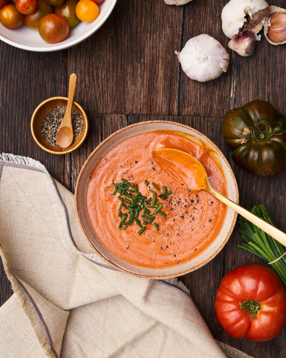 Serve this cold tomato soup chilled with garnishes for a light lunch or appetizer. It’s the perfect dish to make ahead as the flavors continue to meld together as it sits.