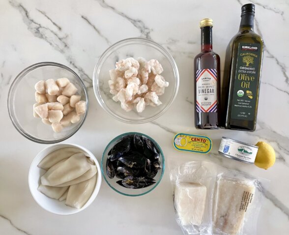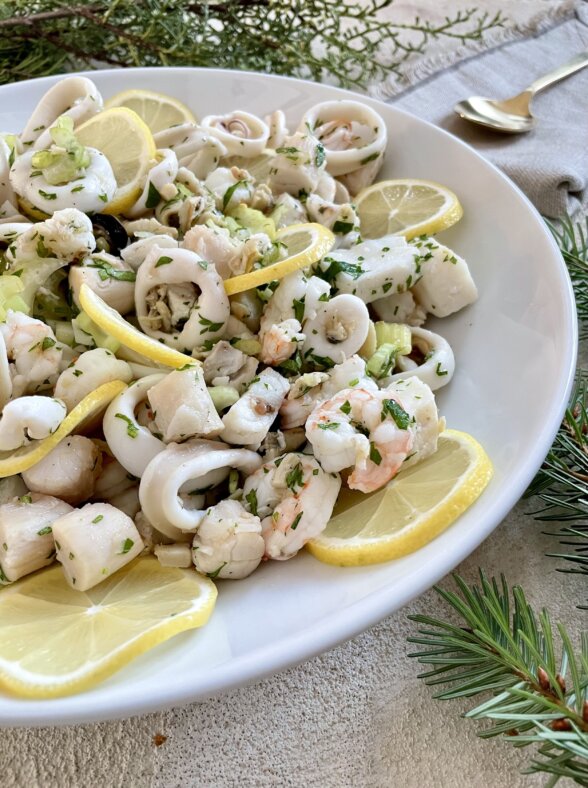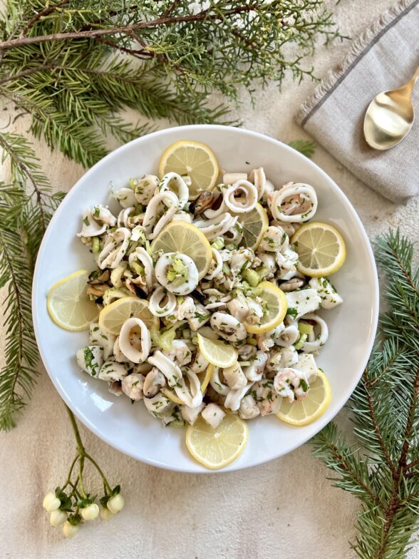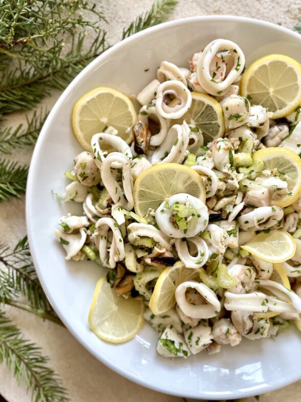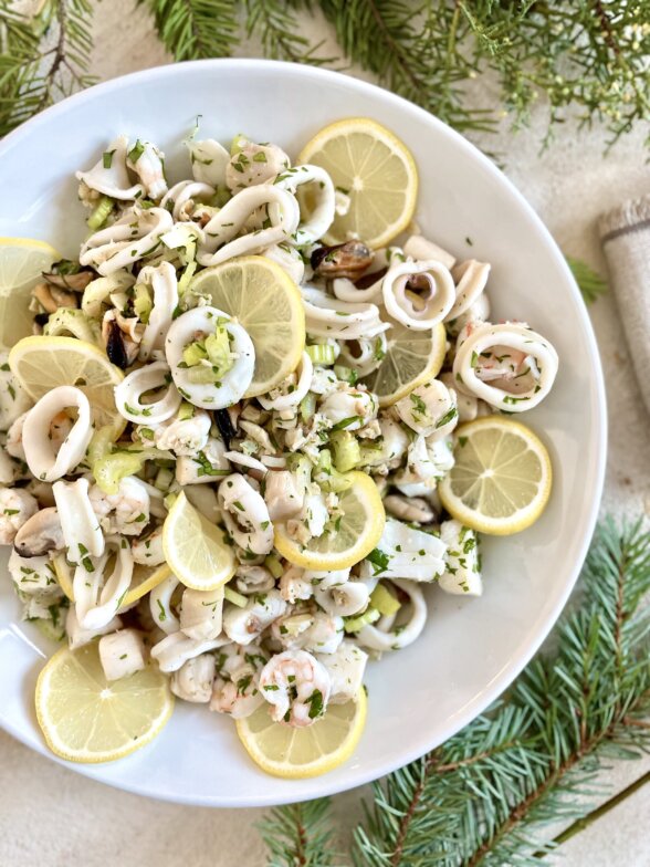 My family is Italian which means seafood for Christmas Eve! I’m not sure where the tradition originated to serve “seven fishes” on Christmas Eve, but we generally serve more than that because our dinner is a potluck for about 110 people. We eat linguine with clam sauce, stuffed clams, eel, bacala (salt cod), salmon, and a mixed seafood salad like this one. This cold seafood salad is something I love to order at a restaurant as well because it has such a delicious mix of different seafoods and a bright tangy vinaigrette.
