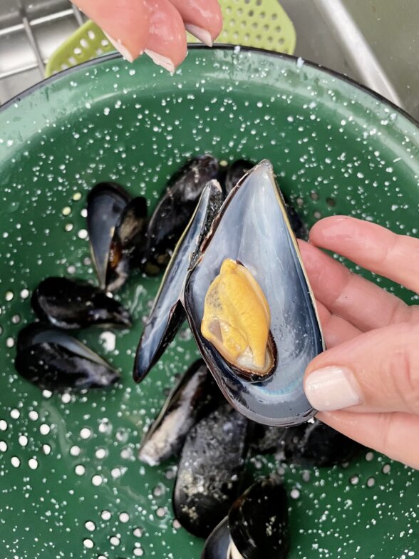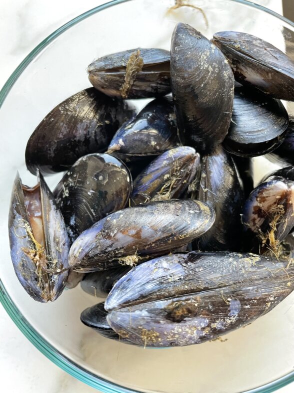 - Mussels – I always rinse mussels and scrub them with a brush. I also remove the beard sticking out of the shell. Any broken mussel shells should be discarded.