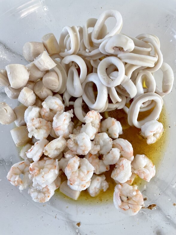 - Prep ahead tip: you can buy and cut all seafood the night before you plan to make this or defrost it the day before, if you purchased frozen.