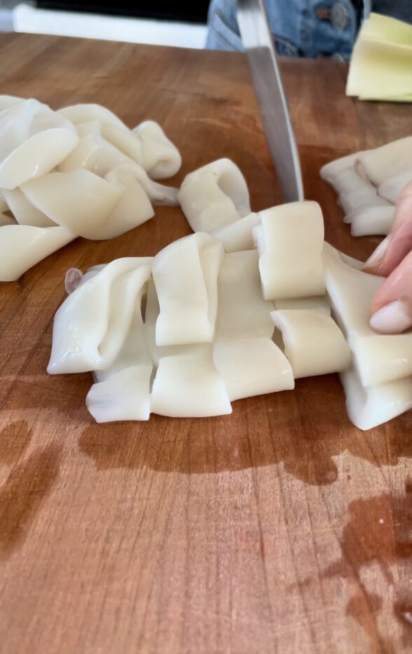 - Squid – I always rinse seafood before cooking it. I prefer the tubes in this recipe. I like to slice the squid into 1/2-inch rings.