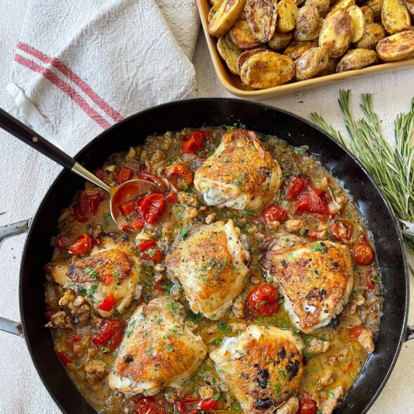 Step 6: Return the sausage to the skillet and place chicken on top of the onion mixture. Transfer to the oven and roast at 450°F for about 10 minutes, or until chicken is cooked through and an instant-read thermometer inserted into the thickest part of the thigh registers 165°F. It’s hard to give an exact time since it depends on the size of the thighs and how long you seared them earlier, your thermometer will tell you when they’re done!