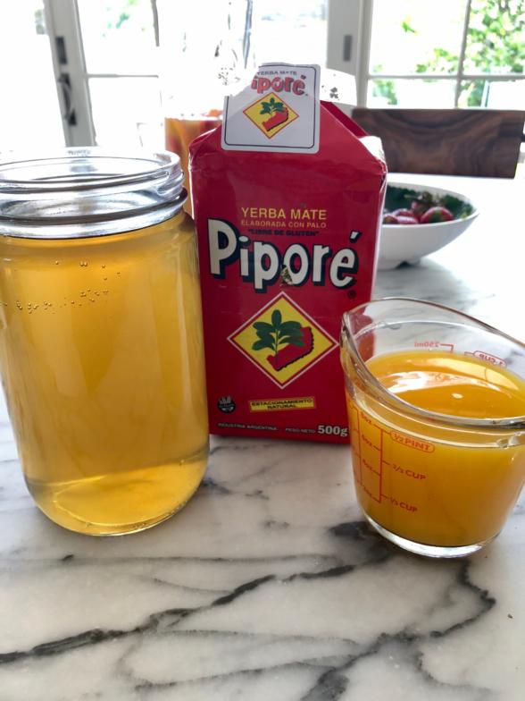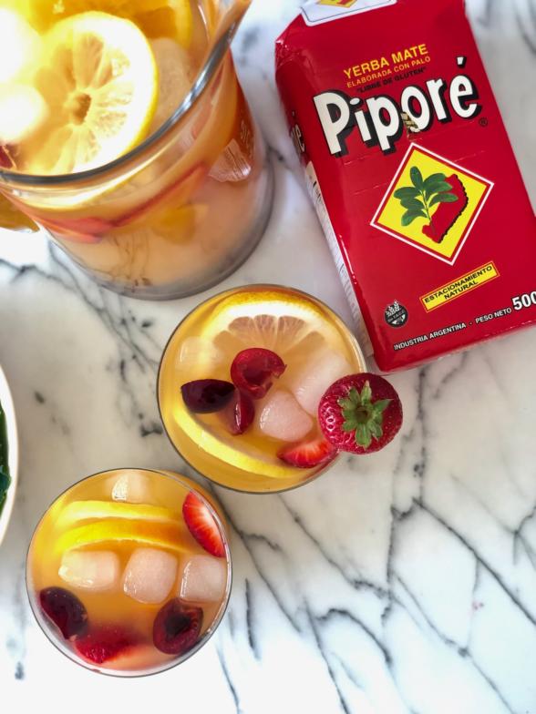 I hardly ever serve beverages in my house other than water or tea (I drink Argentine yerba mate more than anything else.) Ā I never buy soda or fruit juice. Ā Once in a blue moon, my daughter will buy some kombucha and my husband makes a lot of unsweetened iced tea. Ā But in the summer, especially if we have other families over, I like to have one non-alcoholic drink, like an agua fresca, lemonade or iced tea. Ā My lemonade recipe in my cookbook uses orange juice to sweeten it in addition to sugar. Ā I decided to use that to make a sweetened iced tea with my favorite Argentine Yerba Mate and load the pitcher with fruit. Ā Oh my stars – SOOOOOO refreshing and delicious!!!
