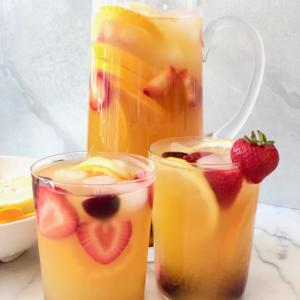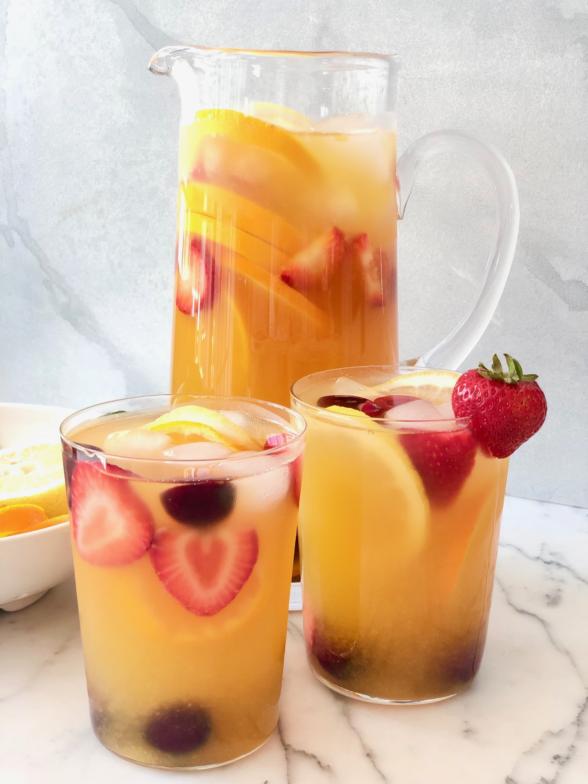 - Sliced fruit: 1 orange, 1 lemon, 1 pint hulled strawberries, 2 cups cherries, pitted