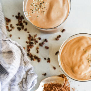 I originally tried this smoothie at the breakfast event I co-hosted for Dr. Lipman’s book in the spring and I was instantly smitten. What I loved about it was that it wasn’t too cold and it wasn’t overly sweet. I felt satisfied and full until lunchtime and I had no blood sugar spike and crash. Plus it tasted delish, like a creamy mocha delight! The addition of cinnamon has also gotten me addicted to the flavor of that spice with chocolate. It’s my new favorite. As always, there is room for adaptation here – sub sunflower butter for the almond butter or ghee for the coconut oil. There are even natural coffee substitutes if you don’t do regular coffee. Lastly, I’m not a huge fan of protein powders since so many of them are full of junk. I used the vanilla Vital Proteins collagen powder, but I’d love to hear what your favorite clean protein powders are!