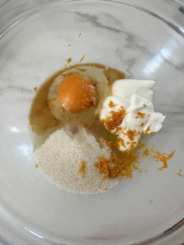 - In a medium bowl whisk together the sugar, yogurt, egg, vanilla, almond extract, and orange zest.