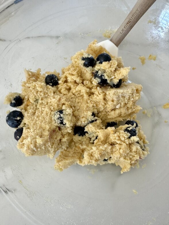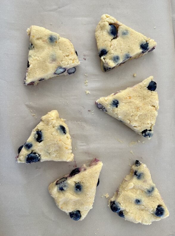 - Mix wet mixture into dry just until incorporated. Stir in the blueberries. Form into a 7-inch disk and transfer to a baking sheet lined with unbleached parchment paper. Cut the disk into 6 wedges and spread each wedge about 2 inches apart.