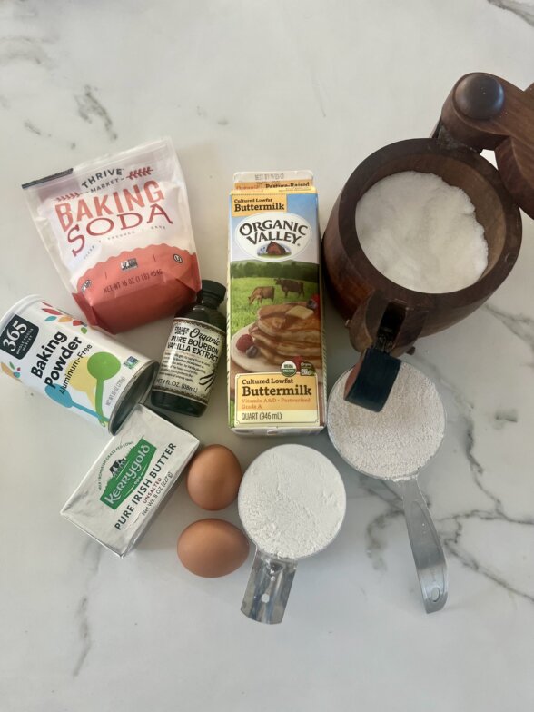 - To make pancakes, blend buttermilk, eggs, melted butter, and vanilla in a blender until smooth. In a large bowl, whisk together the flour, baking soda, baking powder, and salt. Mix wet mixture into dry and don’t overmix. Pancake batter can be made a day in advance and stored covered in the fridge.