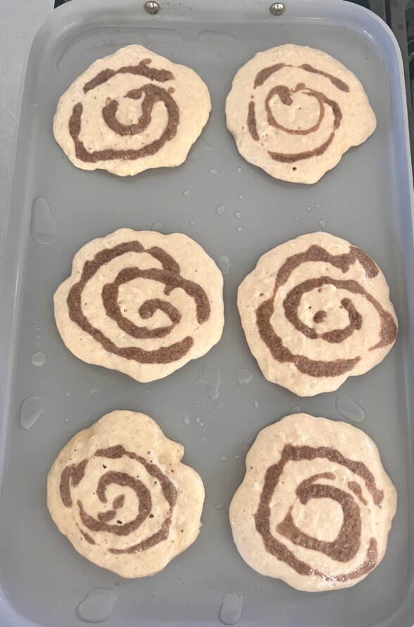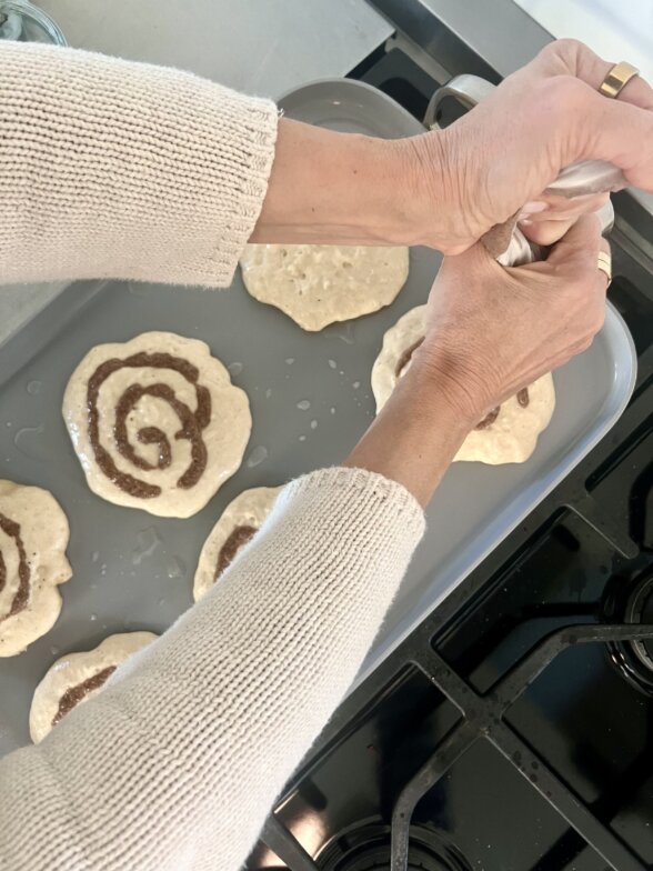 - Melt a little coconut oil on the griddle or skillet. Raise the heat to medium. Form pancakes and immediately squeeze the cinnamon mixture in a swirl over the pancakes. Flip when they start to bubble at the top and cook until set.