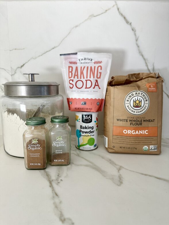 - In a medium bowl, whisk together the flours, baking powder, baking soda, salt, cinnamon, and nutmeg.
