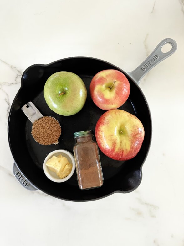 - Heat an 11-12” cast iron or oven-safe skillet over medium heat and add the apples, butter, brown sugar, and cinnamon.