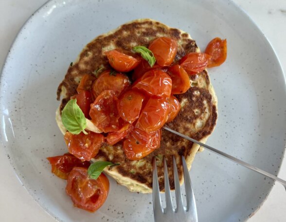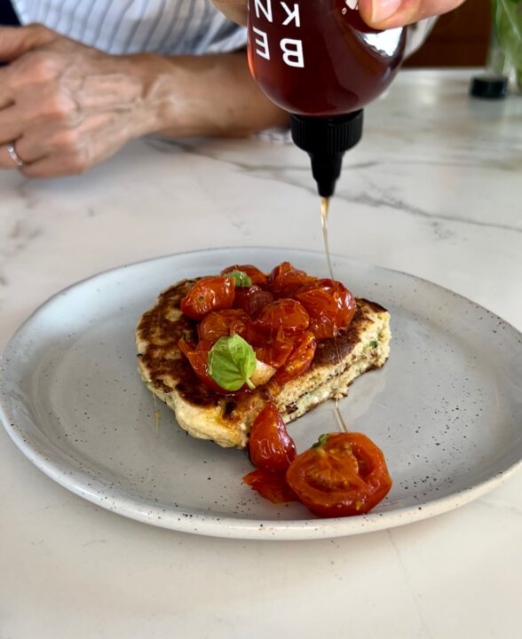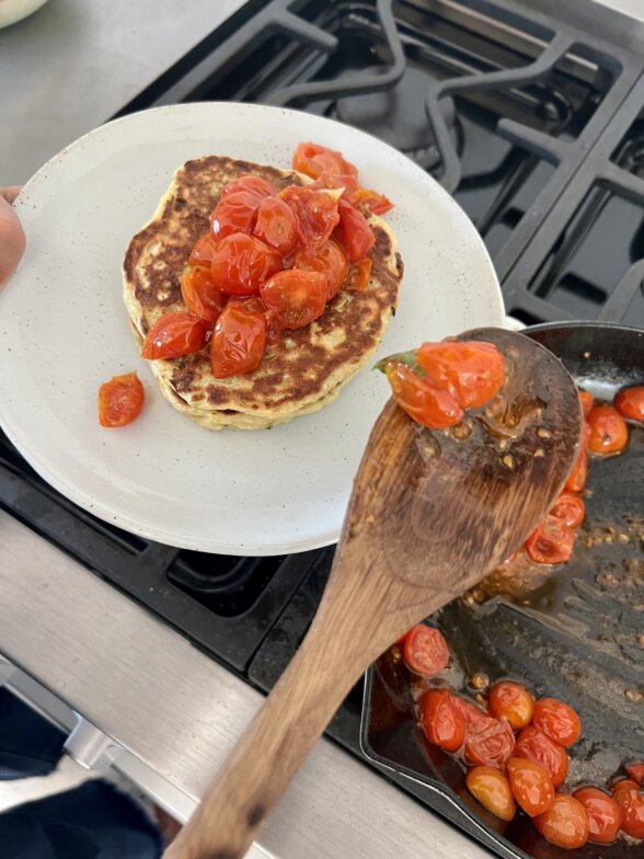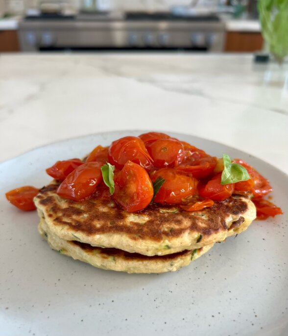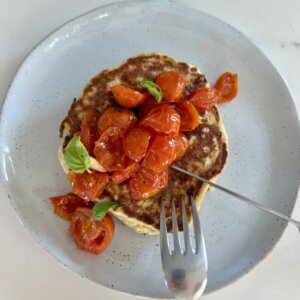 Maybe you love pancakes, but you need an extra protein boost in your breakfast. Or, perhaps savory breakfasts help keep you from craving sweets all day. Or, maybe you like breakfast for dinner. If any of the above rings true for you, you will LOVE these savory ricotta pancakes! I topped them with sauteed cherry tomatoes, basil and hot honey, but you can truly top them with so many savory ingredients. I can’t wait for you to dig into these!
