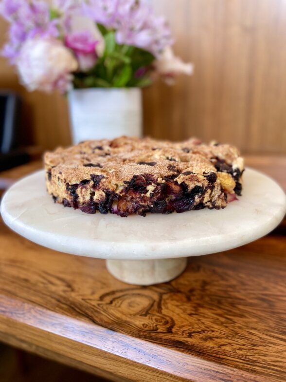 A buckle is basically a coffee cake with way more fruit than you’d put in an actual cake. Sometimes you’ll see recipes for fruit buckles with a serious crumble topping plus a glaze. But you know my style for desserts is to keep the sugar at a minimum and not go overboard. I am crazy for the combo of stone fruit and berries, which is perfecto for summer. But if you want to change up the fruit, by all means go for it!