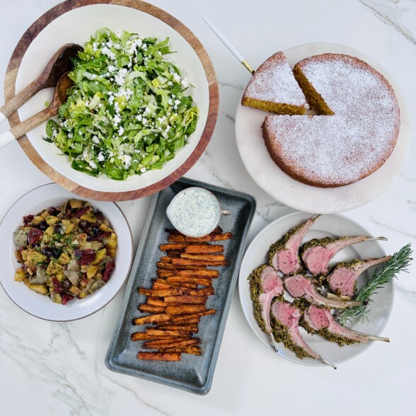 Italian Almond Flour Carrot Cake, Mediterranean Artichoke–Potato Ragout, Roasted Carrot Fries with Green Goddess Sauce, Herb-Crusted Rack of Lamb, Maroulosalata