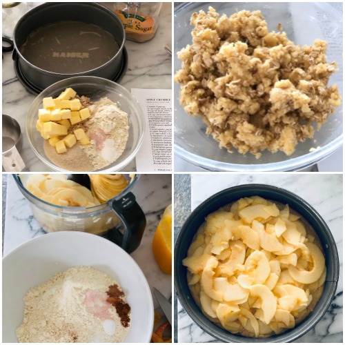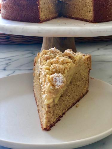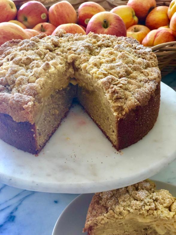 - Arrange the apple slices evenly over the batter. Sprinkle the crumble topping over the apples. Bake in the center of oven, until a cake tester inserted in the center comes out clean, 40-50 minutes*. Let cool in the pan for 10 minutes. Run a knife around the edges to loosen the cake and remove the springform ring. Cool completely before serving. Dust with powdered sugar if desired before serving.