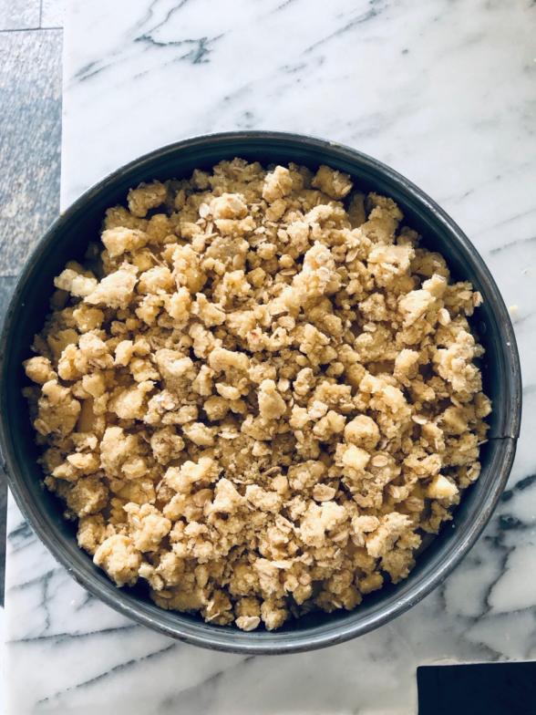 - Make crumble: In a large mixing bowl, with your hands combine all topping ingredients until no longer dry. Set aside in the refrigerator or freezer.