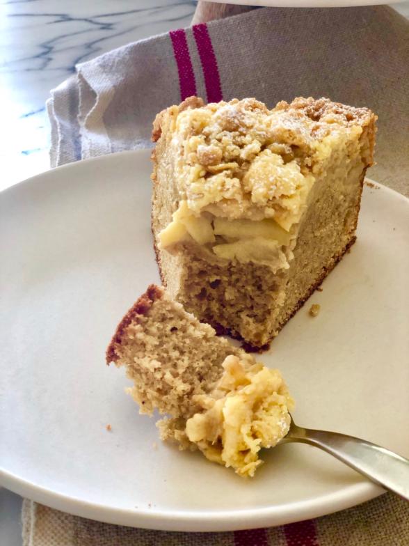 I was confident in this cake since I tweaked an existing cake recipe (the blueberry-lemon loaf with cornmeal crumb topping from a spring class), topped it with sliced apples and a crumb topping recipe that I tweaked from my cookbook. The result was glorious – a moist, perfectly spiced cake with tender apples and a crunchy, crumbly top. As with all my desserts, I aim to reduce the sugar as much as possible while keeping them “normal,” as my son says. So this cake is not terribly sweet and would be delightful for brunch, as well as dessert.