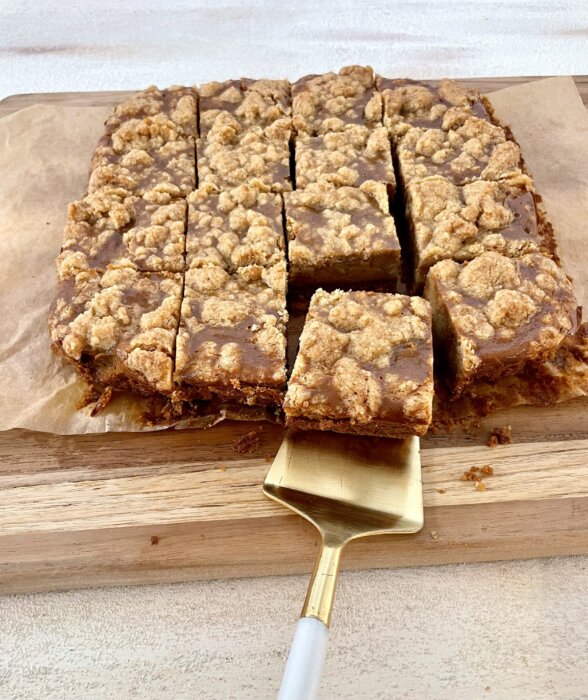 - Crumble topping evenly over filling. Bake until filling is set and the topping is golden, about 45 minutes. Allow to cool completely, cover and refrigerate. Can be made up to 3 days in advance. When ready to serve, run a thin knife around the perimeter of the baking dish and use the parchment overhang to lift out the bars.