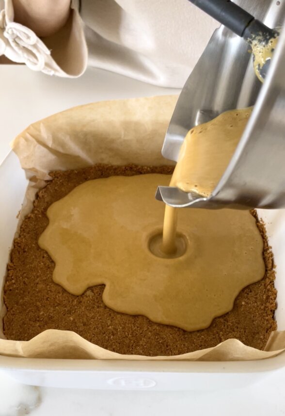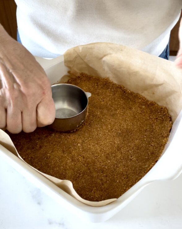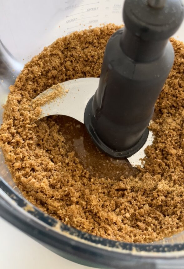 - Prepare the crust: process cookies and coconut oil in the bowl of a food processor fitted with the metal blade until it resembles wet sand. If you don’t have a food processor, you can smash the cookies into crumbs in a disposable bag and combine with the coconut oil in a large bowl. Transfer mixture to the prepared baking dish and press crumbs firmly into the bottom of the dish making an even layer. The crust should be about ¼-inch thick. You can use the bottom of a measuring cup to do this. The better you press the crust, the better it will hold together.