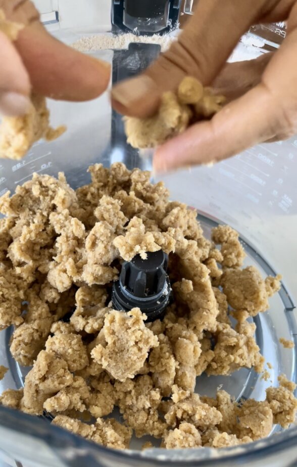 - Prepare the topping: Pulse all the topping ingredients in a food processor or in the bowl of a mixer fitted with the paddle attachment. This can also be done by hand or with a pastry blender. The goal is to get the mixture to be moist, not dry, and in pea-size clumps. Squeeze with your hands to create small clumps. Place in the fridge to keep cold while you make the filling. You can make the topping a couple days in advance and keep refrigerated.