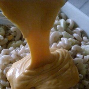 - Pour the “cheese” sauce over the cooked pasta and combine until completely coated. Spread the mixture into an un-greased 11 x 8 casserole dish, sprinkle with prepared breadcrumb mixture. Bake for 30 minutes or until the sauce is bubbling and the top is golden brown. If you add veggies (such as 1 or 2 cups of blanched cauliflower or broccoli) to the macaroni, cook in a 13 x 9 dish.