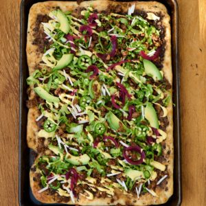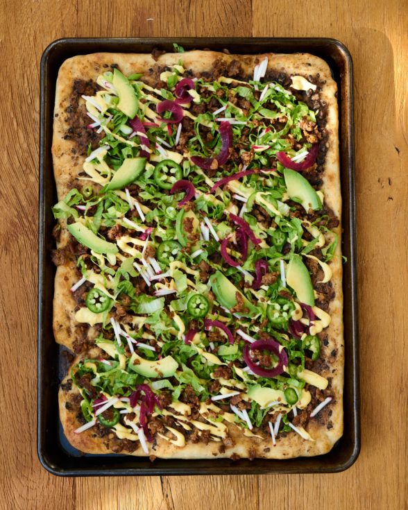 Quarantine is hard enough. At least let us have our game day snacks! For sure, I will make a big sheet pan of vegan nachos, guacamole and crudites, probably a pot of vegetable chili or do a baked potato bar. And this! I am calling it a taco pizza. Take your favorite pizza dough or even packaged naan bread (which IMO is a perfect swap for an individual pizza – it’s like a prebaked crust), and load it up with all the taco/burrito fixings.