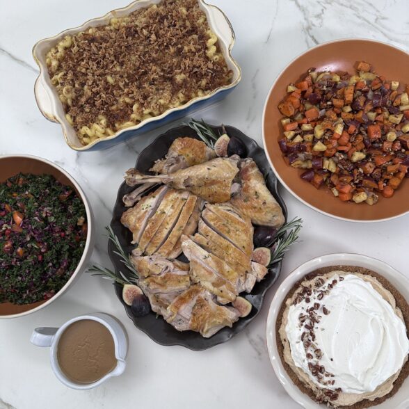 Candied Bourbon Pecan Root Vegetables, Caramelized Onion and Gruyere Mac and Cheese , Confetti Kale Salad with Persimmon and Pomegranates, Cooking a Turkey in Separate Parts, Pumpkin Mousse Pie (no bake filling)