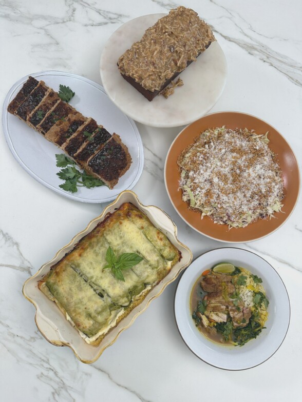 Recipes in September Class: Dark Chocolate Loaf Cake with Sticky Coconut Topping, Golden Chicken Bowl with Vegetables and Rice, Nerano-Style Zucchini Lasagna, Sheet Pan Balsamic BBQ Turkey Meatloaf , Tahini-Caesar Slaw with Crunchy Sesame Crumbs