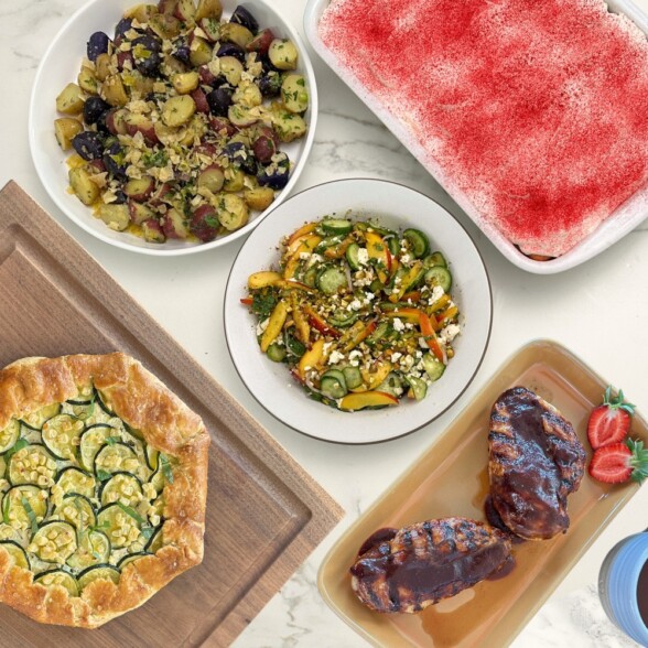 Grilled Chicken with Smoky Strawberry BBQ Sauce, Nectarine and Cucumber Crunch Salad, Savory Galette with Ricotta, Zucchini, Corn and Hot Honey, Summer Berry “Tiramisu”, Zippy Potato Salad