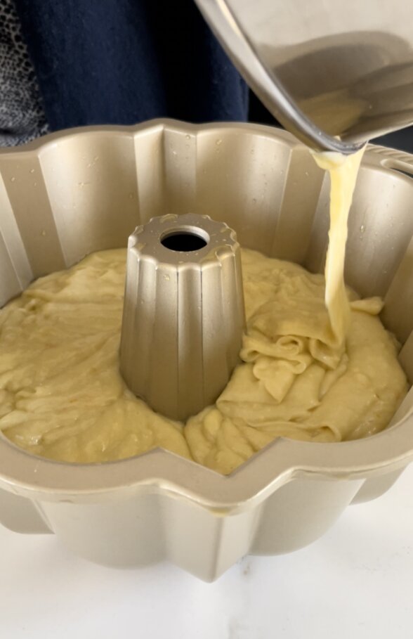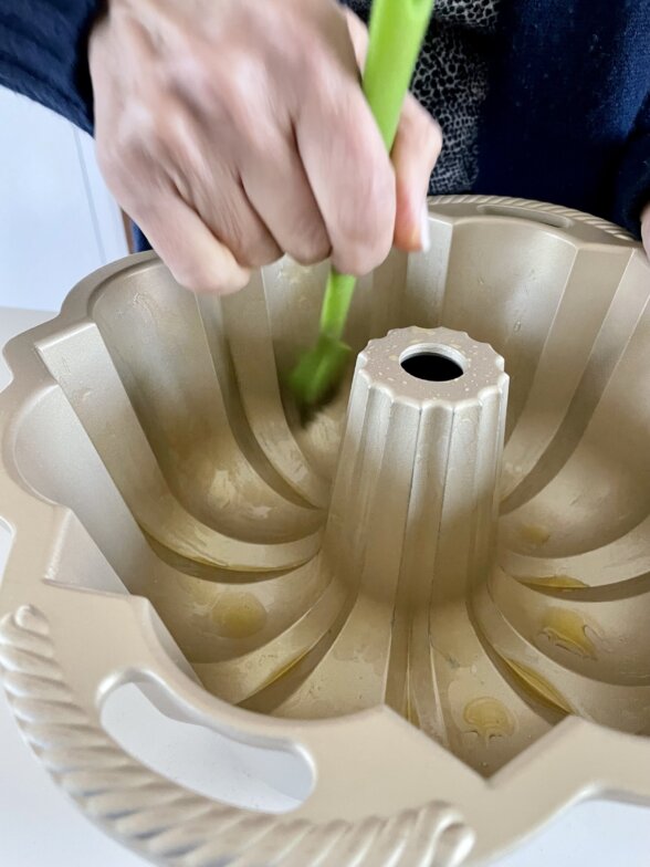 - Position oven rack so that the bundt pan will be in the center of the oven and preheat oven to 350 degrees F. Grease a Bundt pan with olive oil. I like to use a pastry brush to get into all the crevices. You can turn the pan upside down in the sink to prevent the oil from pooling at the bottom. If you prefer to use butter to grease, butter and flour the pan and tap out the excess flour.