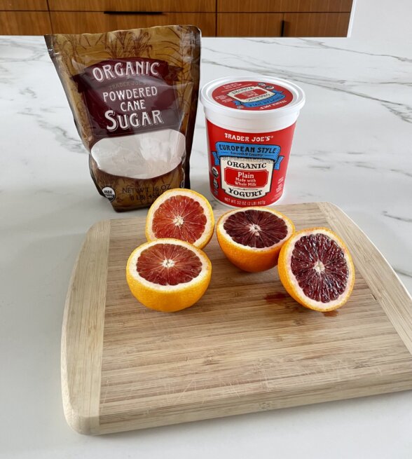 - 2 –3 Tablespoons strained citrus juice, blood orange juice looks pretty!