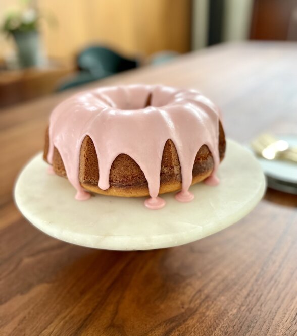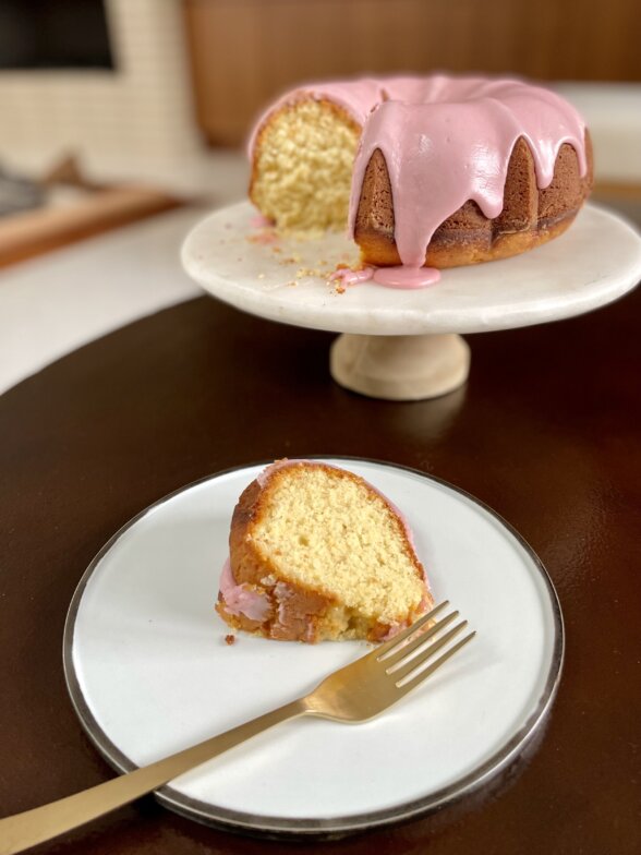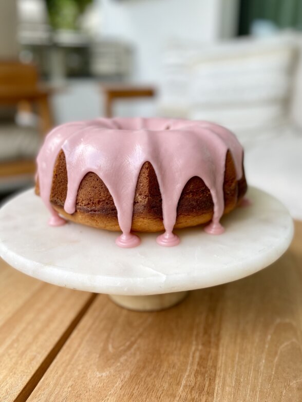 - Meanwhile, make the glaze by whisking the citrus juice (I like to start with 2 Tablespoons), yogurt, and powdered sugar in a medium bowl until smooth. You can add more citrus juice gradually, if needed. The glaze should be thick, but still pourable. You can test the consistency by scooping some of the glaze with the whisk and drizzling it over the bowl. When the cake is completely cool, transfer cake to a serving dish and drizzle all of the glaze over the cake. I like to pour the glaze along the top of the cake and it will naturally drip down the sides of the cake. The glaze will firm up as it sits. This cake can be stored loosely covered at room temperature for up to a week.