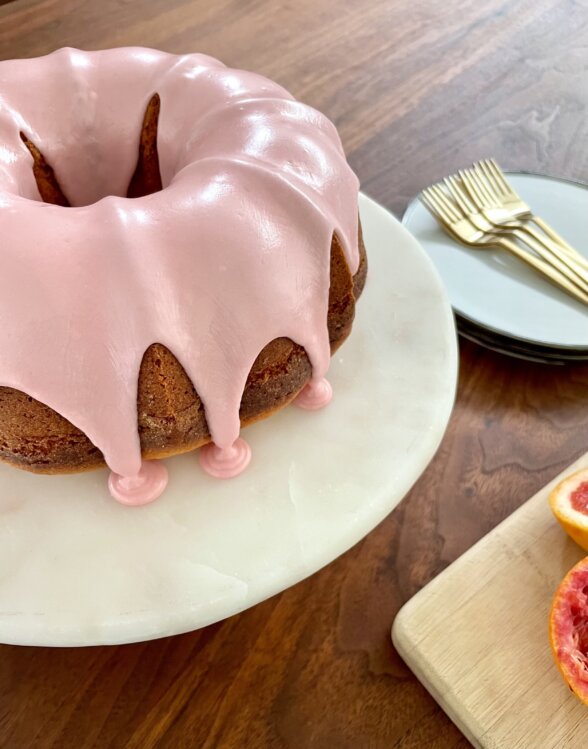 I taught this cake last year in a Mediterranean-inspired class and it quickly became a favorite. If you are skeptical about olive oil in a cake, try it!! It’s a delicious, fruity fat and cakes last longer with oil instead of butter. Olive oil is the perfect match with citrus, other fruits like apples, chocolate, and herbs in desserts (I have a crazy good recipe for a chocolate chunk cake with rosemary.) You can dust it with powdered sugar or make this glaze with whatever citrus you have. Blood oranges and pink grapefruit are particularly pretty!