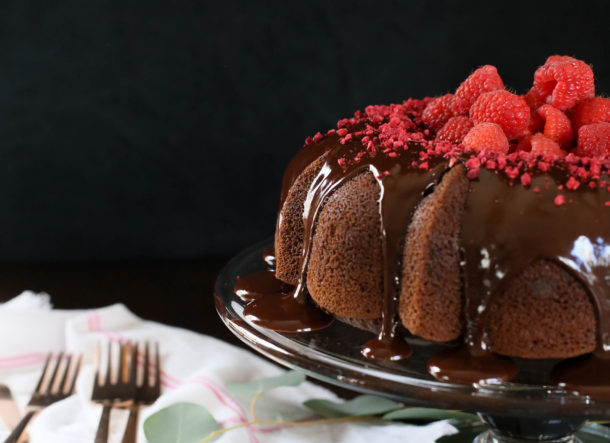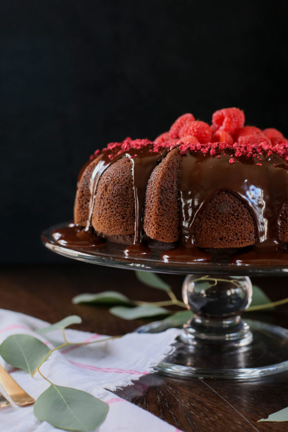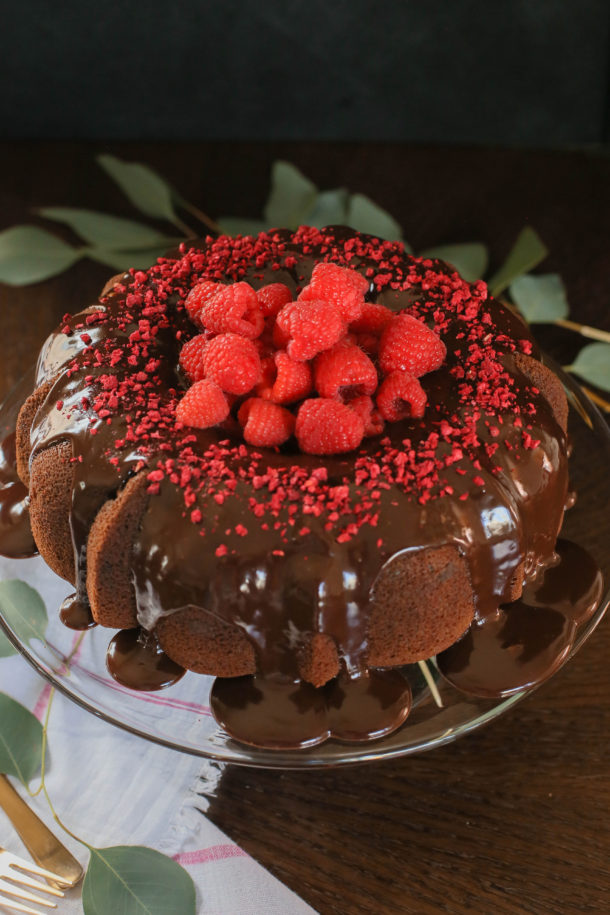 I made these flourless chocolate cakes with raspberry sauce for years and last year I made these chocolate chip “cookie dough” bites. But this year, I’m going big with this incredible chocolate bundt cake with ganache and raspberries galore. I actually taught this cake in my December classes and Jenni Kayne already posted it on her website, but you know I like to share my own thoughts about my recipes.