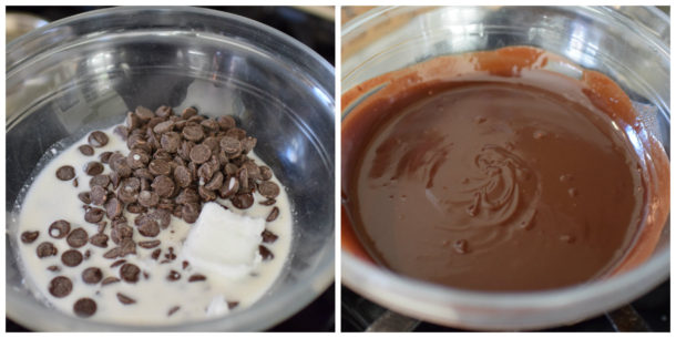 - To make the ganache: in a double boiler or heat-proof bowl set over a pot of simmering water, melt together the chocolate, coconut milk and coconut oil. Whisk until completely smooth.